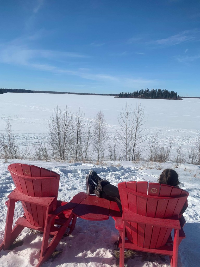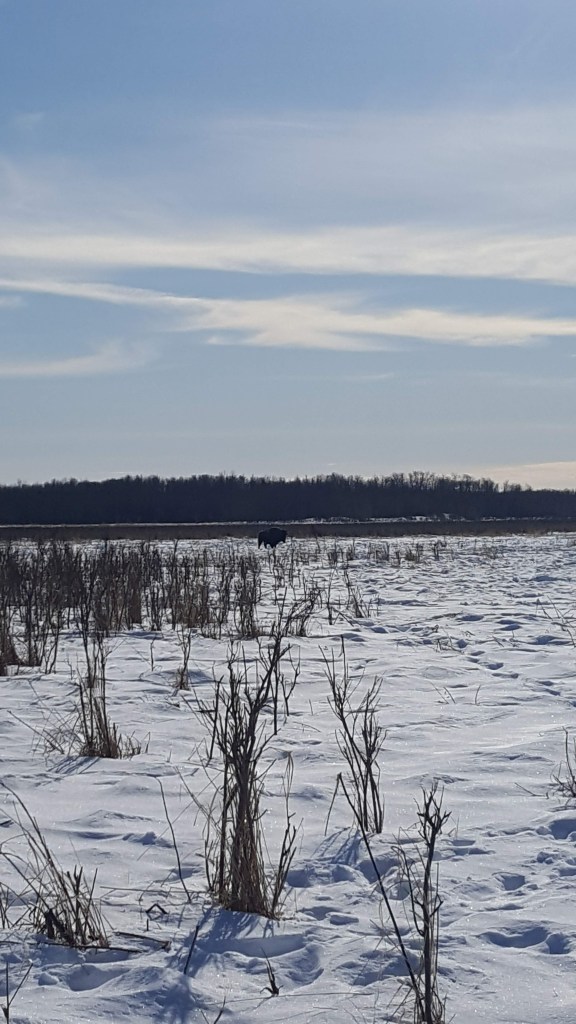We found a large prairie got the snowshoes on and started searching for the bison. Side not snowshoeing is more tiring than it looks. After heading out into the prairie a little we started to make our way to the other trail feeling a little disheartened that we hadn’t found the bison. As we were walking we turned around and there they were, hiding behind some bushes. We slowly inched our way closer to them still keeping a safe distance but it was pretty amazing. We all just stood there completely still for around 10 minutes just watching them. They slowly starting walking away and would turn to look at us but then just move on. All of us just enjoying nature and the beautiful day. After watching the bison off we headed back to the car and continued to explore the park to see what else that we could find. We headed to one of the lakes and just walked around before heading out. It was a beautiful warm sunny day and it was so nice to spend it out side in the fresh air exploring.